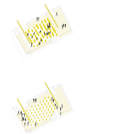 ESP//Para realizar el proyecto consistió en la realización de un conjunto de cajas de diferentes alturas, cuya parte inferior se casa con la pendiente. Así, la parte superior del bloque es perfectamente recta y se convierte en el soporte de una exposición, o un conjunto de mesas y asientos. Finalmente, todo el conjunto en movimiento en el espacio se convierte en un juego de pachinko gigante.
